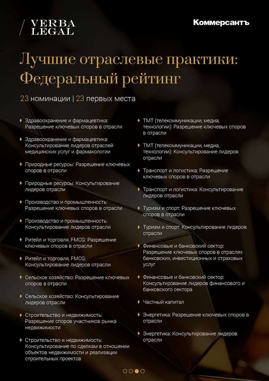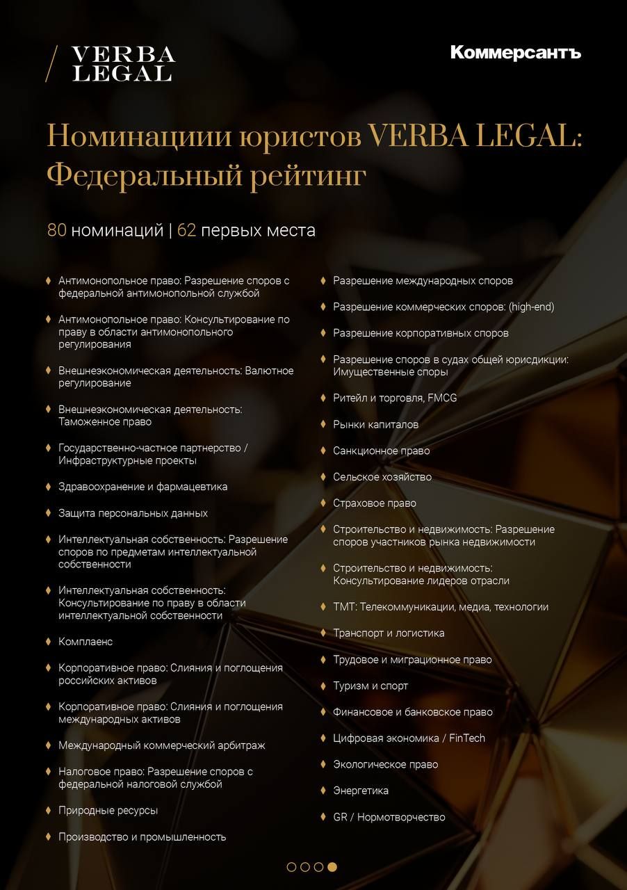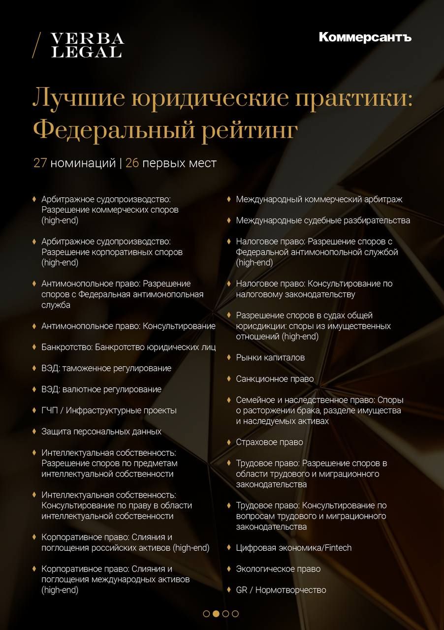 Вчера состоялась церемония награждения ежегодного рейтинга лучших юридических компаний «Коммерсантъ», на которой VERBA LEGAL была признана лучшей фирмой в рекордном количестве номинаций: